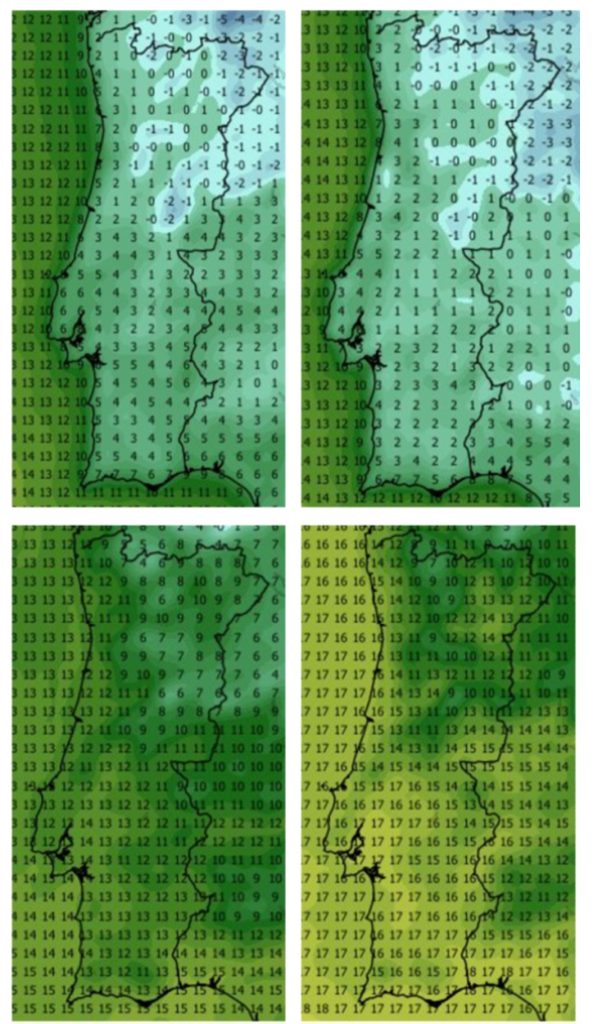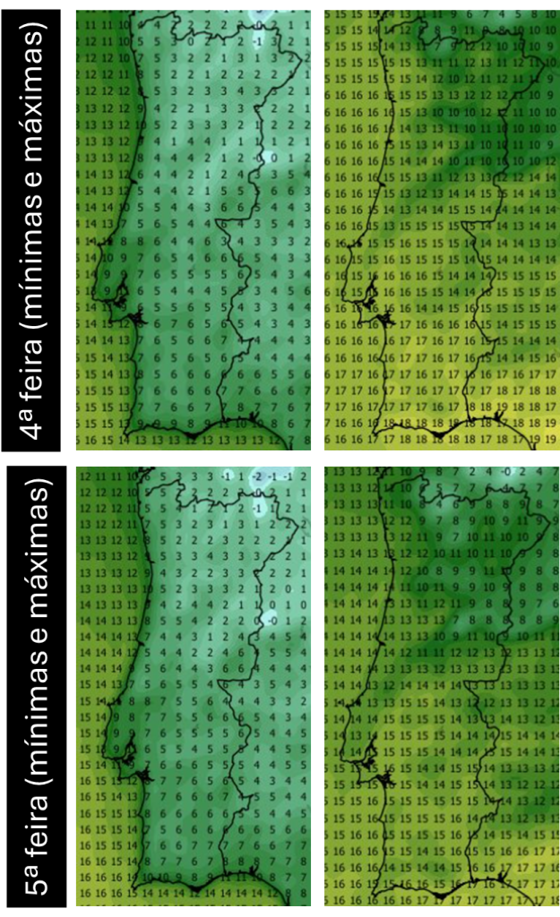 Deixamos de seguida a previsão pelo modelo europeu, das mínimas e máximas para 4ª e 5ª feira: