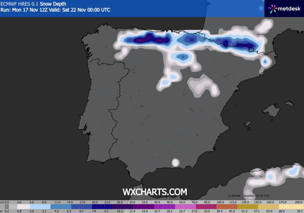A imagem seguinte mostra o acumulado de neve no solo prevista pelo ECMWF na meia-noite de sábado, dia 22 de novembro (entre o branco, mais superficial e o lilás, mais profundo).