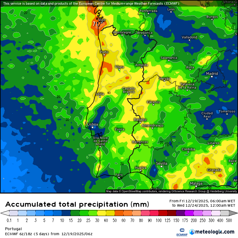 Até dia 23, o modelo europeu tem esta previsão de acumulado de precipitação: